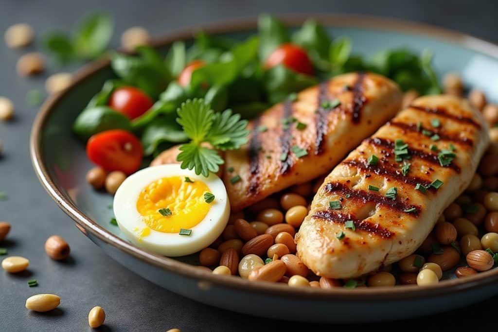 - Integriere Eiweiß in jede Mahlzeit: Achte darauf, dass jede Mahlzeit eine gute Eiweißquelle enthält. Das kann zum Beispiel ein Stück Hühnchenbrust zum Mittagessen oder eine Handvoll Nüsse als Snack sein.